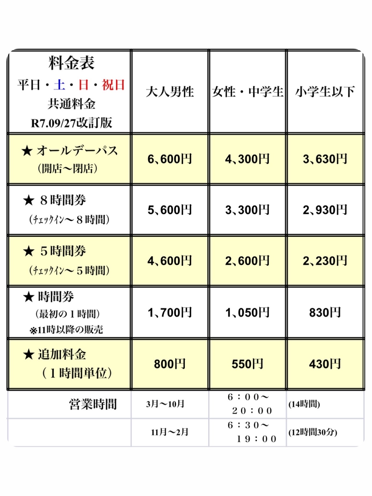 2022 11/23(祝)より 料金・喫煙ルール他
