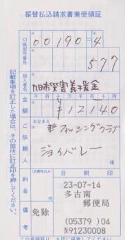 皆様のご協力を深く感謝致します。 H24 3/30 現在の集計をお知らせ致します。 近隣の旭市への義援金を店頭にて募集させて頂き 先日、皆様からお預かりしました義援金を 旭市へ振込手続きをしてきました。 尚、集まりました金額、旭市の募金先等については、 今後もホームページ及び管理棟内へ提示し御報告させて頂きます。 フィッシング クラブ ジョイバレー スタッフ一同 |